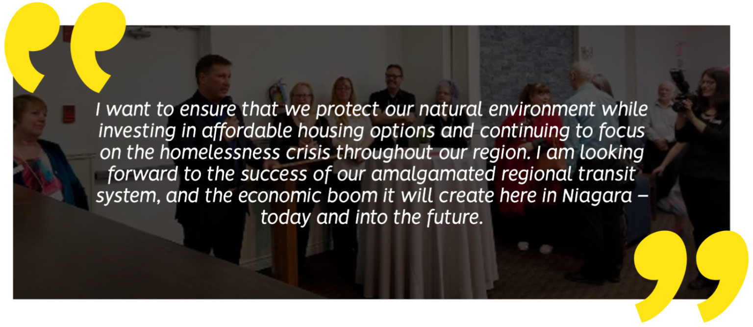 Over the last three years Niagara Region has invested over $20 million, which when combined with funds from other levels of government totals over $43 million, into bringing more affordable housing into the market. At the Region, Pat will continue to focus on incentive programs for new developments to include affordable housing and fight homelessness.